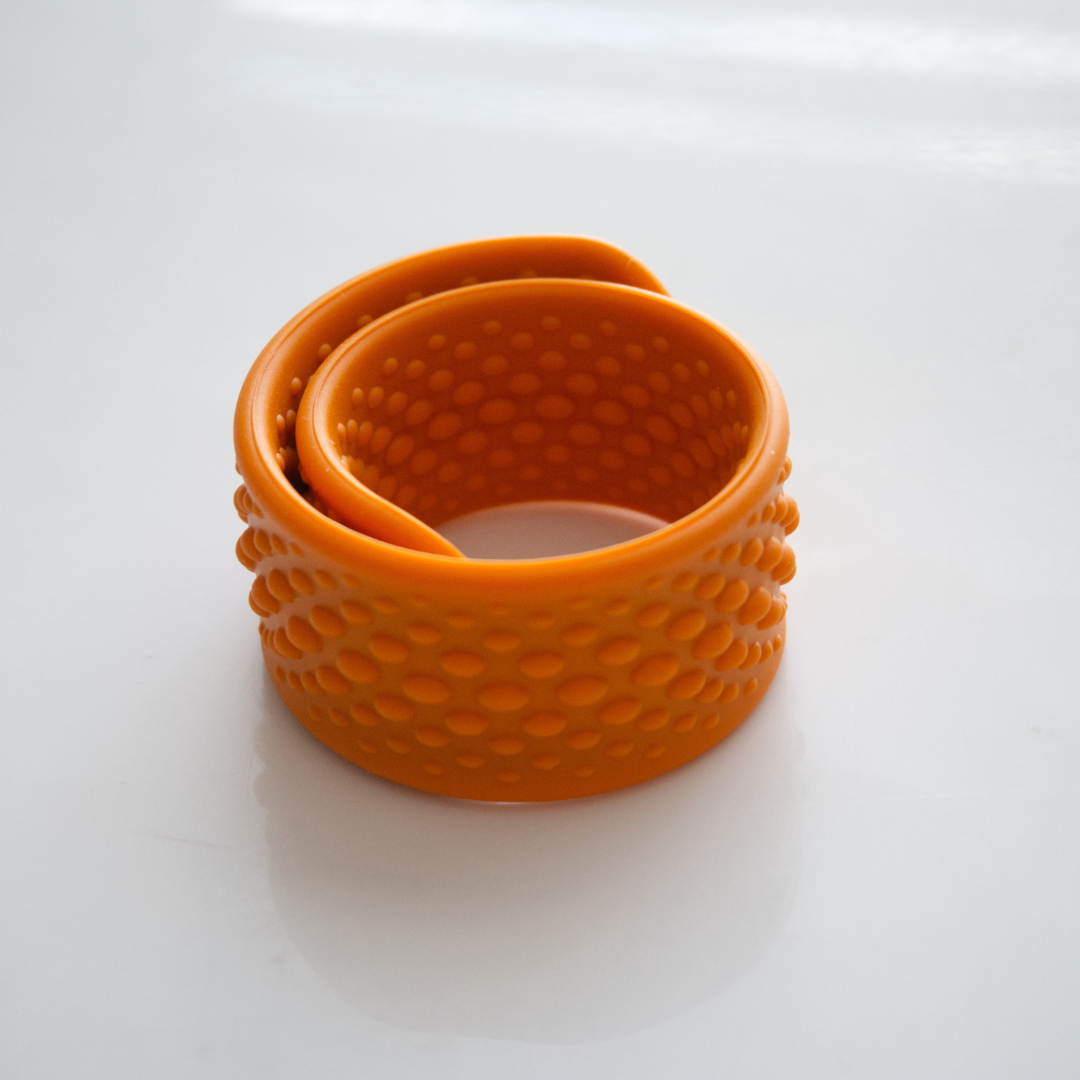 Mechanical Warning (Slap Motion): These bracelets contain an internal metal spring-core that creates the "slap" function. Only apply to the wrist using a gentle snapping motion. To avoid skin irritation or bruising, do not snap the bracelet against the skin with excessive force.