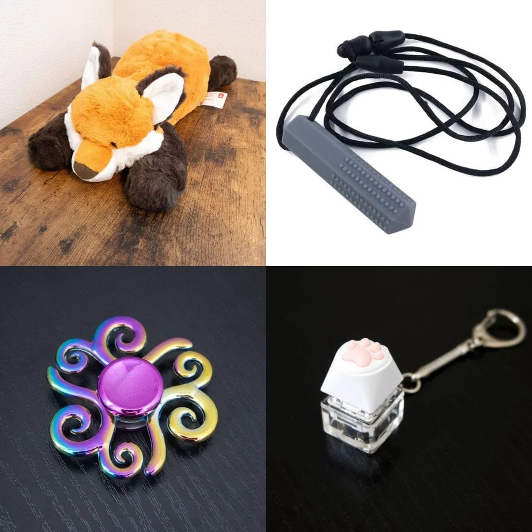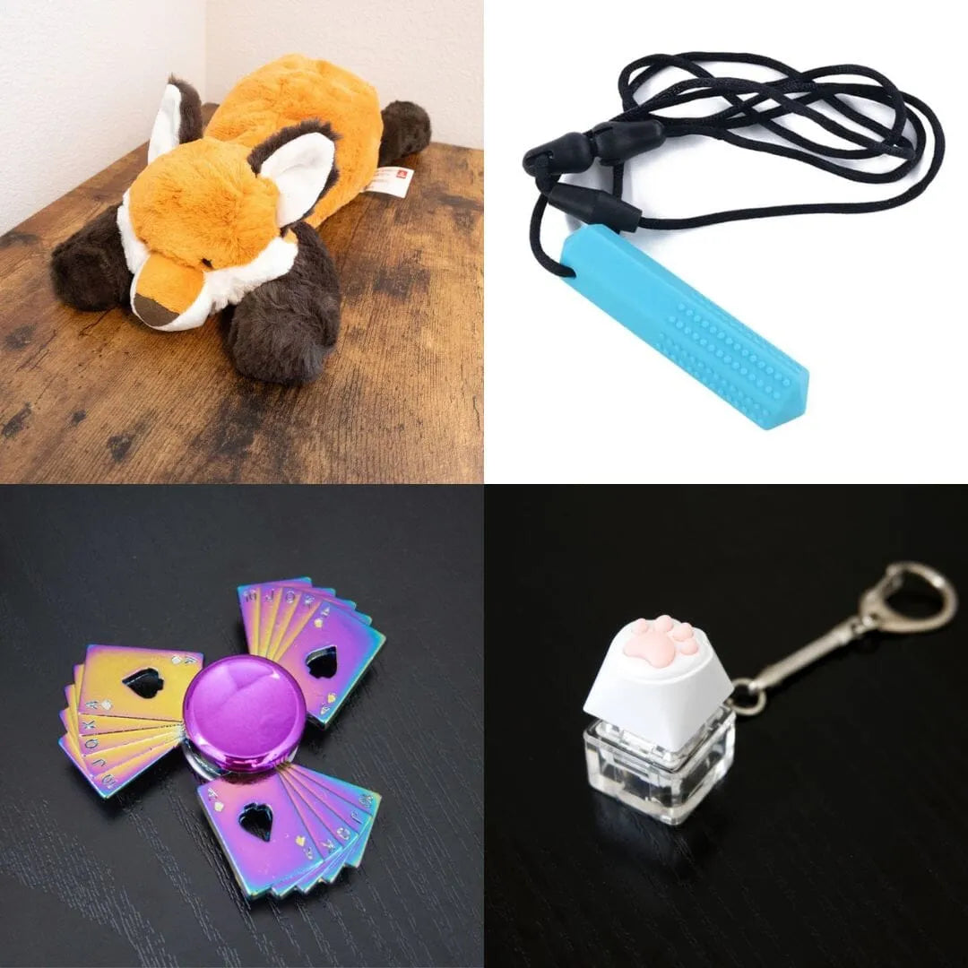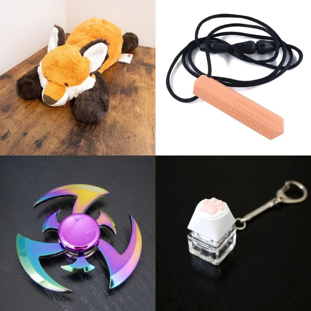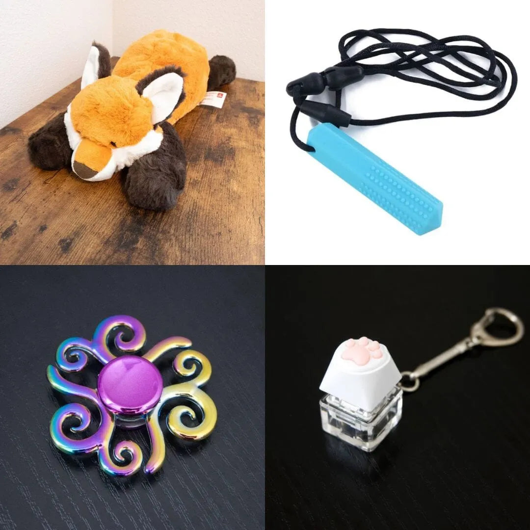 This bundle includes a super soft Fox plush, a Paw Keyboard Fidget Keychain, a Rainbow Fidget Spinner, and a Textured Prism Chew Necklace available in five colors.